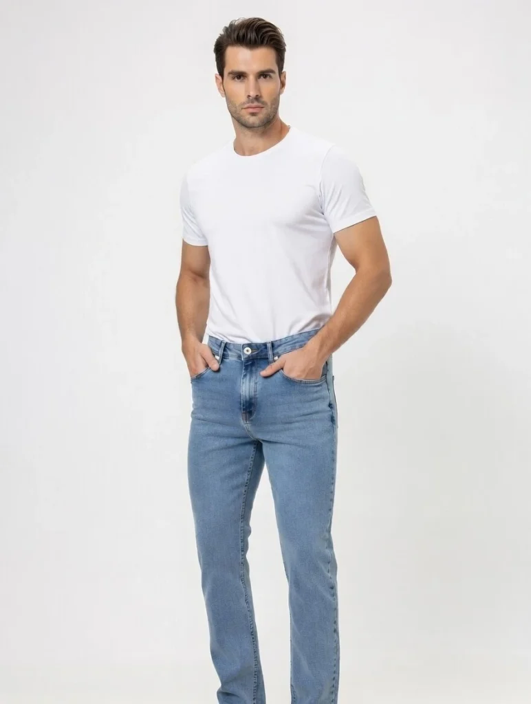 Mid Blue Wash Stretch Denim Jeans – Classic Straight Fit